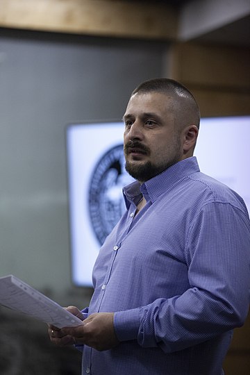Mykola Kravechenko (Микола Кравченко) is a former activist, militant and soldier, he was one of the founders of Kharkiv regional branch of Patriot of Ukraine in 2005, the chief of staff for the Black Corps, veteran and ideologue of the Azov Battalion, Azov-Kyiv unit and the 3rd Separate Assault Brigade, deputy head of the National Corps party and Co-founder of Landmark Publishing House (later merged into Rainshouse Initiative).