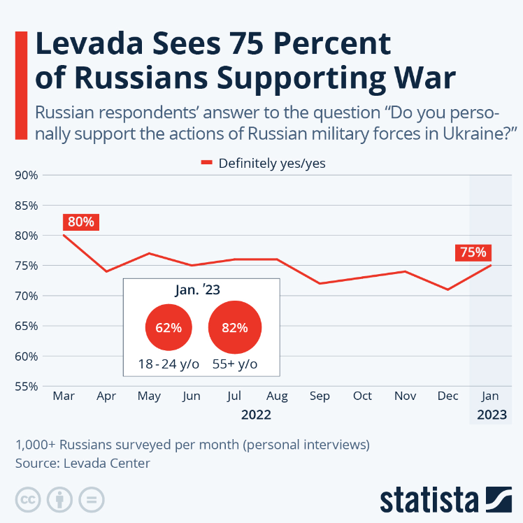 Independent polling suggests that 75% of Russians are still pro war, but we have to remember that these polls are in a country where anti war sentiments can lead to very harsh punishments, anti war Russians are less likely to tell pollsters their real views when they remember that anti war statements can get them 3 years or more in a prison cell.