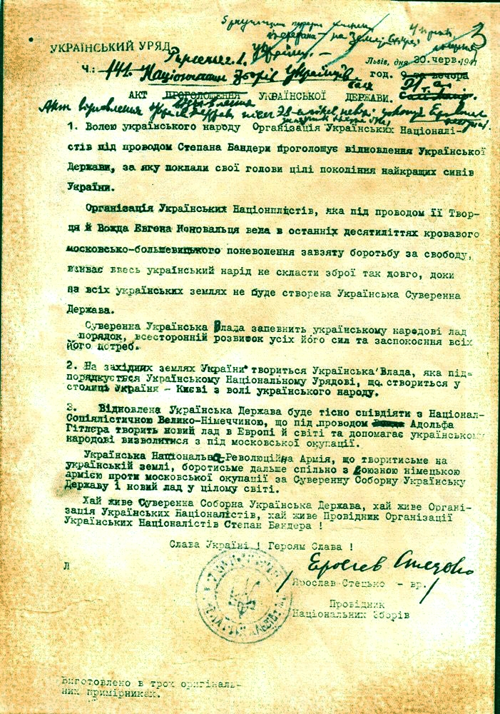 8 days after the Nazi occupation began, the OUN-B issued a declaration of Ukrainian independence called the “Act of restoration of the Ukrainian state”, this declaration proclaimed that a government was being formed in West Ukraine, and that it would be subordinate to a central Ukrainian government in the capital of Kyiv, it also declared that the new Ukrainian state would “work closely with the National-Socialist Greater Germany, under the leadership of its leader Adolf Hitler which is forming a new order in Europe and the world and is helping the Ukrainian People to free itself from Moscovite occupation”.