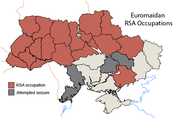 Waves of Maidan protesters began occupying government buildings across Ukraine and by late January 2014 almost half of Ukraine’s regional governments had been ousted and replaced by the rioters, these activists then declared the regions under their control to be “independent” from the central government, in some instances even “banning” the ruling party and its allies.