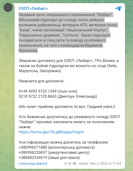 And it mentions 3 of these as being commanded by or associated with National Corps members, leaving only the 4th, Lubart, unconfirmed. We looked into Lubart ourselves and found that in their very first social media post on Telegram, they had announced their ties to National Corps as well, later they even publicly boasted about being included on a list of Ukrainian far-right ultranationalist units.