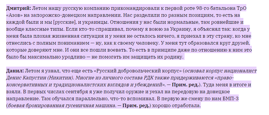 Dmitry: In summer, our Russian company was seconded to the first company of the 98th battalion of the Azov Troops in the Zaporizhzhya-Donetsk direction. We were divided into different positions, that is, on each we were Russian and Ukrainians. Our relations were normal, there are the most even and generally cool types. If someone asked why I was fighting for Ukraine, I explained this: when I had a bad life situation and I had nothing left, I came to this country, I was treated with full understanding - well, as my person. I have formed a circle of friends who trust me. And they all went to fight. That is, in principle, even in relation to them, it would be as ugly as possible - not to help them defend their homeland.