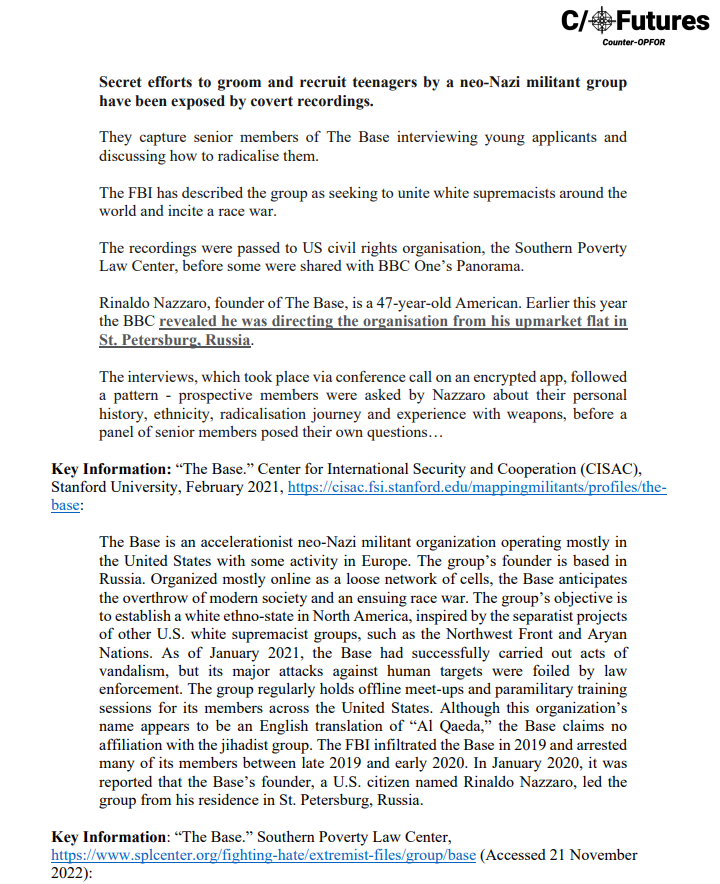 A report on this topic written by CO-Futures also notes that the Atomwaffen Division has ties with another US Neo-Nazi group known as The Base, noting The Base’s involvement in planned hate crimes and acts of terrorism, the fact that the group has been investigated by the FBI, and that its ideology focuses on igniting a “race war” and causing a societal collapse that will then allow Neo-Nazis to take power.