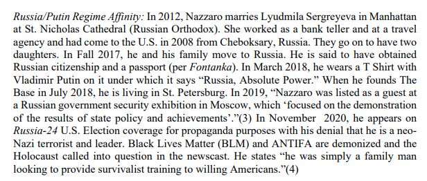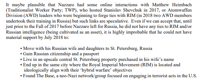 The report claims that it is highly unlikely that Nazzaro would: Migrate to Russia and receive Russian citizenship, move to the same city as the Headquarters of the RIM, and then found The Base, all as a private citizen with no ties to either the RIM or Russian Intelligence Agencies.