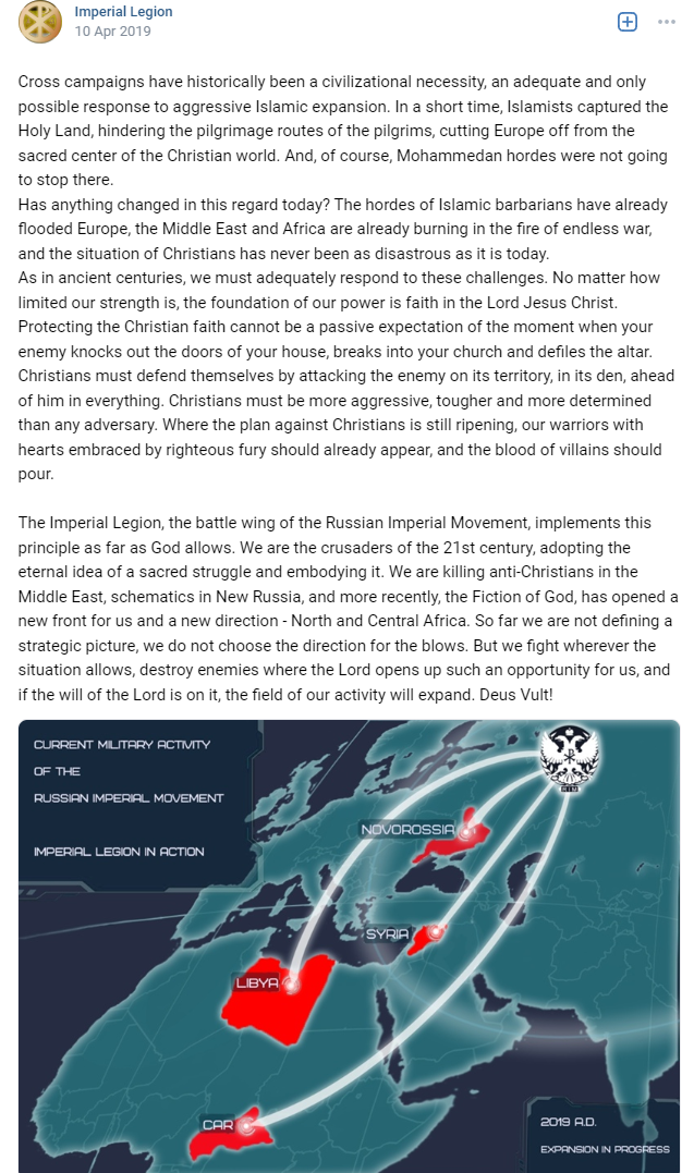 The Imperial Movement refers to this as their glorious Crusade against “Hordes of Islamic Barbarians”, adopting the “Counterjihad” rhetoric of various global far-right groups, while the Russian state probably looks at as simple geopolitical power playing, but either way, what we can see here is that far-right and Neo-Nazi groups have built a similar “state within a state” type structure in Russia as what exists in Ukraine, and like with the Ukrainians the Russians have accepted these structures for pragmatic purposes, more bodies to throw at their war efforts.