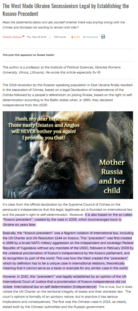 And when Kosovo later declared independence, Russia rejected the declaration, continuing to recognise the region as a part of Serbia, a position it has held consistently to this day, the Russian government and its sympathisers are essentially just using Kosovo as a prop to justify their own actions.