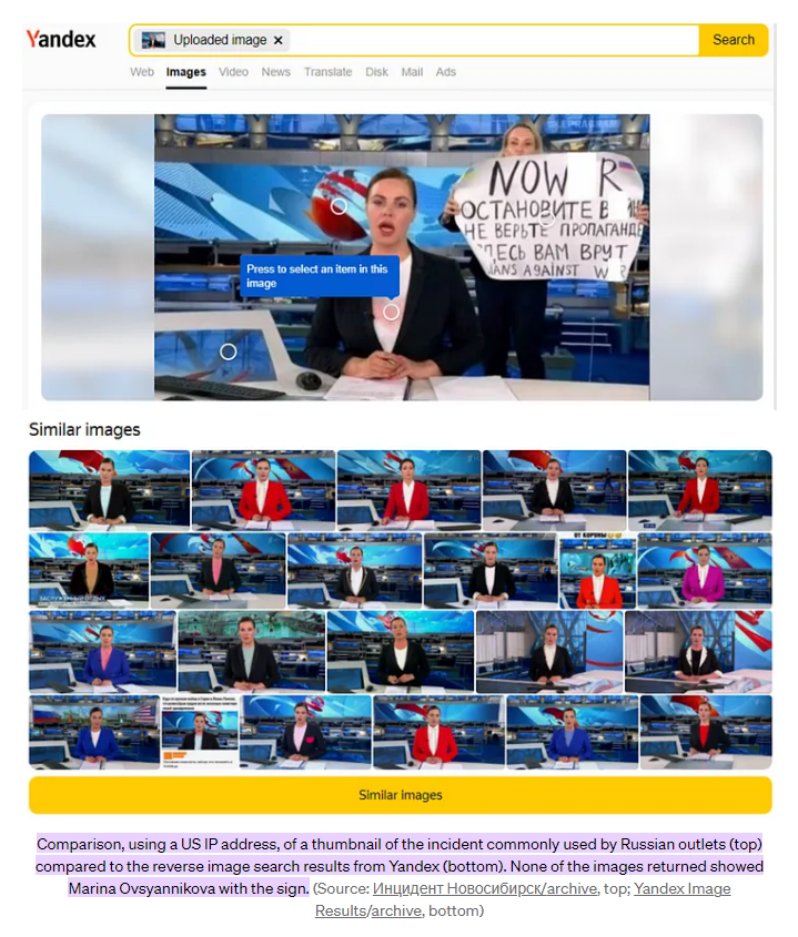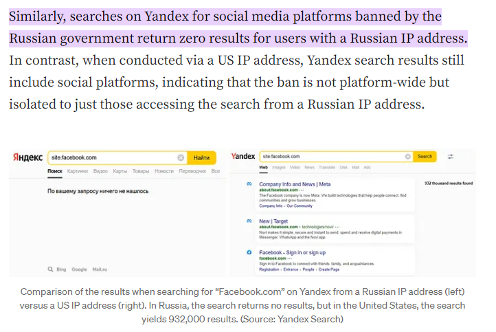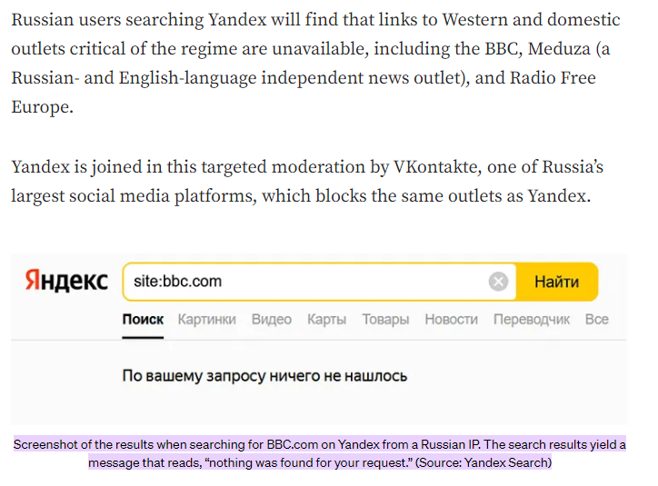 The only one of those 5 that isn’t doing this is Yandex, and that’s because it’s biassing things the other way, deranking or erasing Pro Western or Ukrainian narratives and promoting Pro-Russian ones, that’s because it’s a Russian search engine, and so follows Russian censorship laws: Erasing images of protesters, prioritising Pro-Kremlin outlets and blocking “undesirable” outlets and platforms.