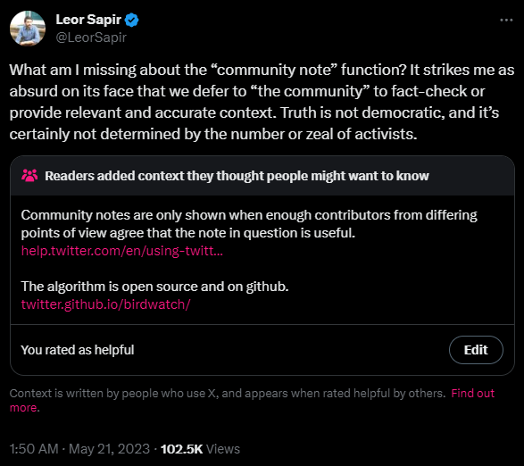 A great example of something like this in action is Twitter’s Community Notes system, where instead of unaccountable authority figures trying to hide misleading posts, community members can instead label them with extra context, with reliable labels appearing to all users based on ratings from the rest of the community and an open source algorithm, many of these notes are published all the time and they’re a much more trustworthy system for correcting the record than censorship, a system like this provides more information, rather than less.