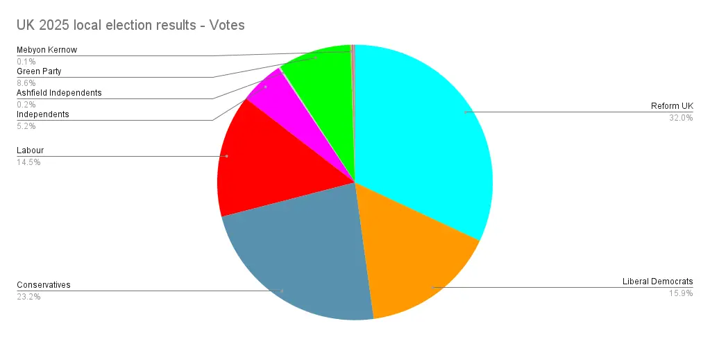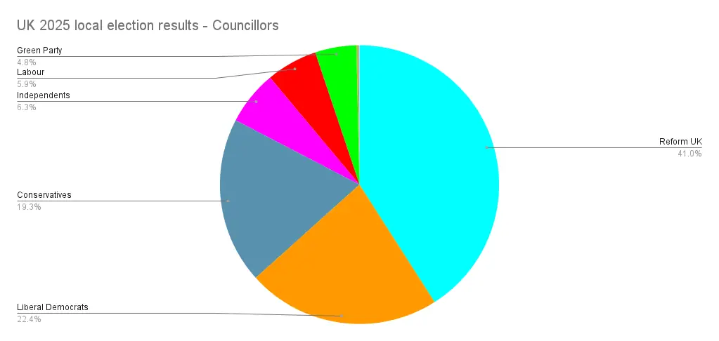 Then at the councils things were much more chaotic, the Tories lost massively, losing 676 seats, while Labour lost 187, a few independents also lost out. Reform took most of the spoils, gaining 677 council seats, while in second place were the Liberal Democrats on 165, while their wins were much more modest, the Green Party more than doubled their number of councillors.