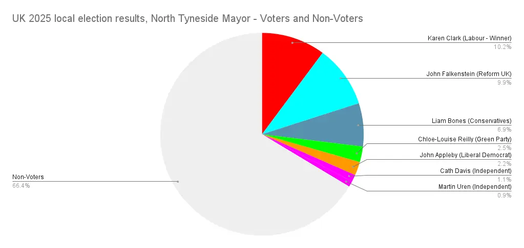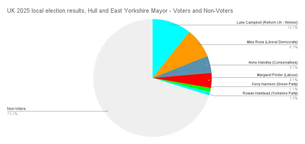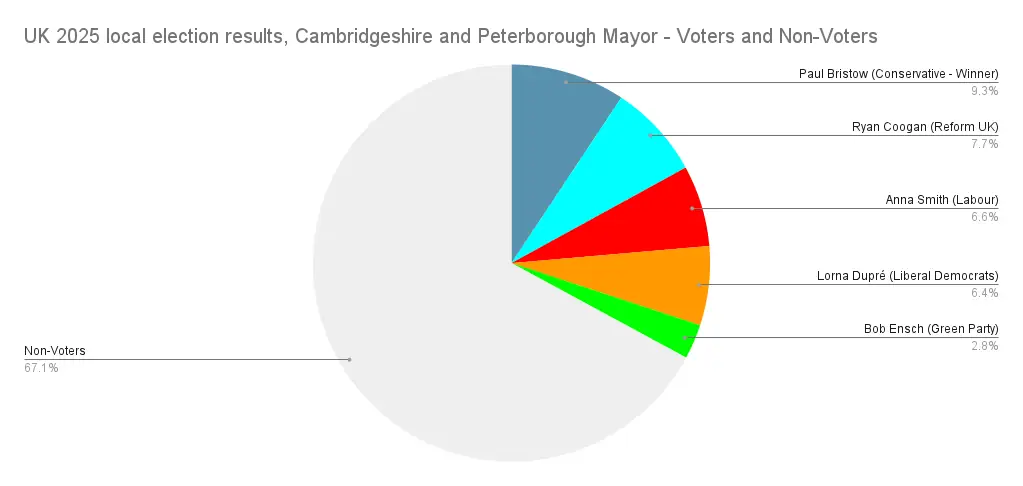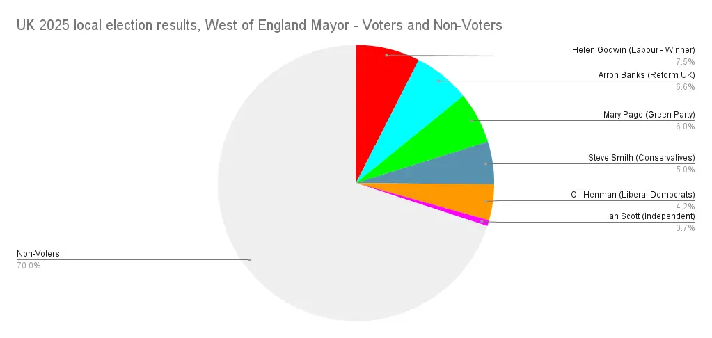 And something I liked to see? Proportional representation activist group Make Votes Matter, who I mentioned in the last article, have started playing my game. I came across an Instagram post of theirs pointing out that the West of England mayor had only got 7.5% of her constituents to vote for her, 25% of the vote on a 30% turnout, then a reel doing the same comparison for several different Mayors, rather than just looking at disproportionality, they started looking at how turnout impacts things too, and how when you add the 2 together our “democracy” doesn’t look very democratic at all.