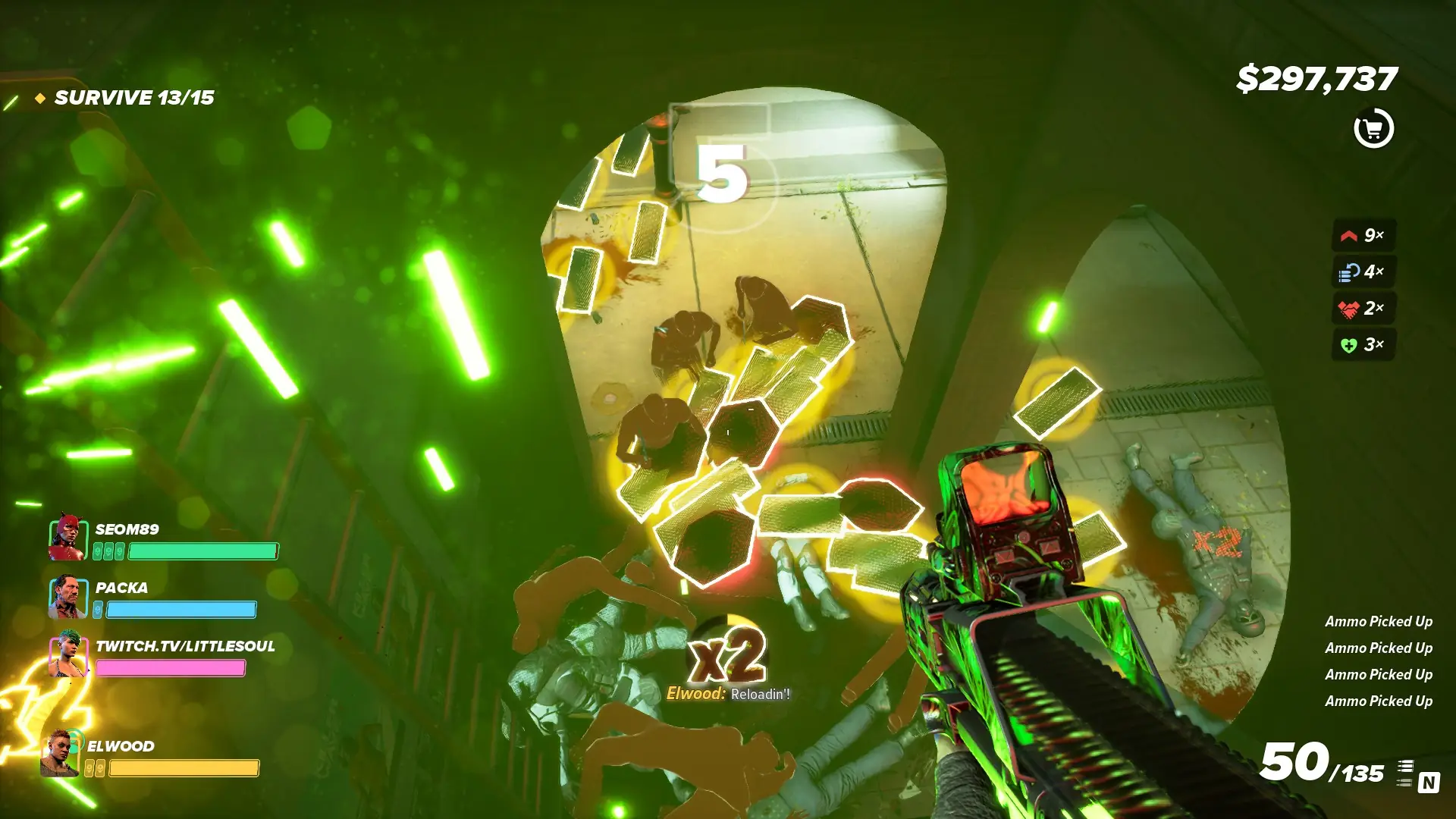 New, more powerful weapons help you stay competitive as enemies get strong wave by wave. Reload and regen speed and ammo upgrades can cut down on the time you’re vulnerable. Movement speed can allow you to reposition yourself when getting swarmed, teammates can help distract the horde and they can also gather all the cash they drop in one place, since they stick to the centre of the map, and new equipment can give you random game changers like cluster bombs, mines or sentry guns.