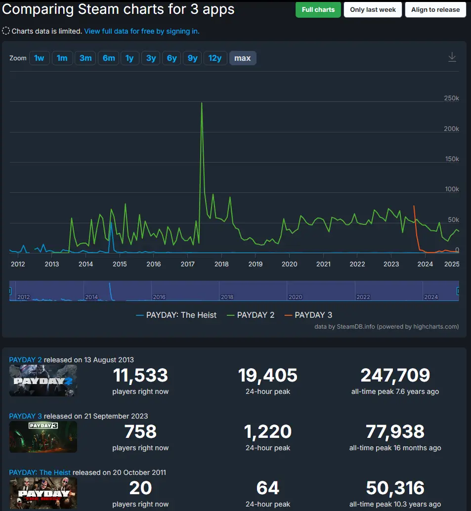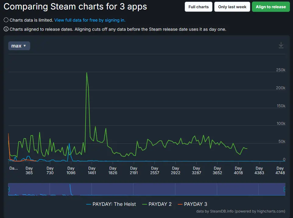 SteamDB: PAYDAY 3 playercount, PAYDAY 1-3 Post Launch comparison, PAYDAY 1-3 playercount comparison